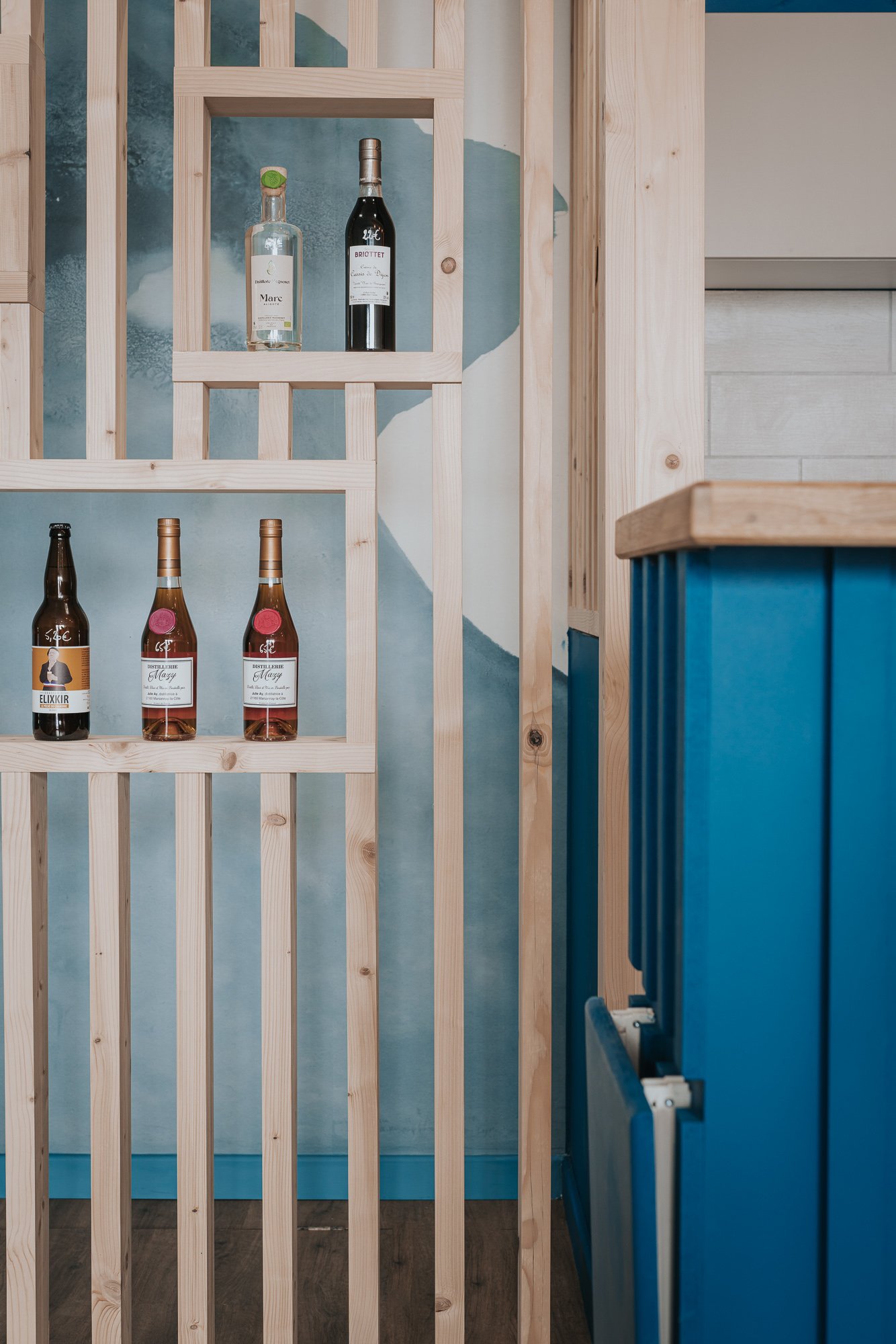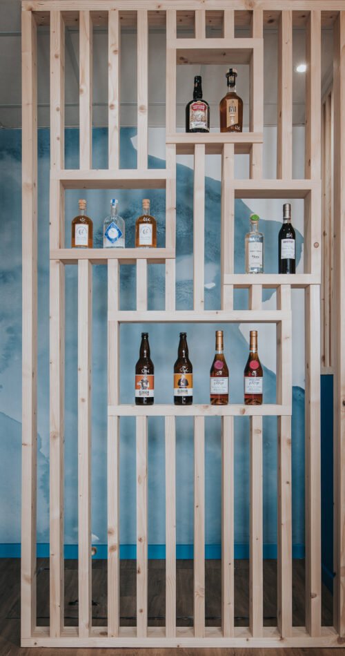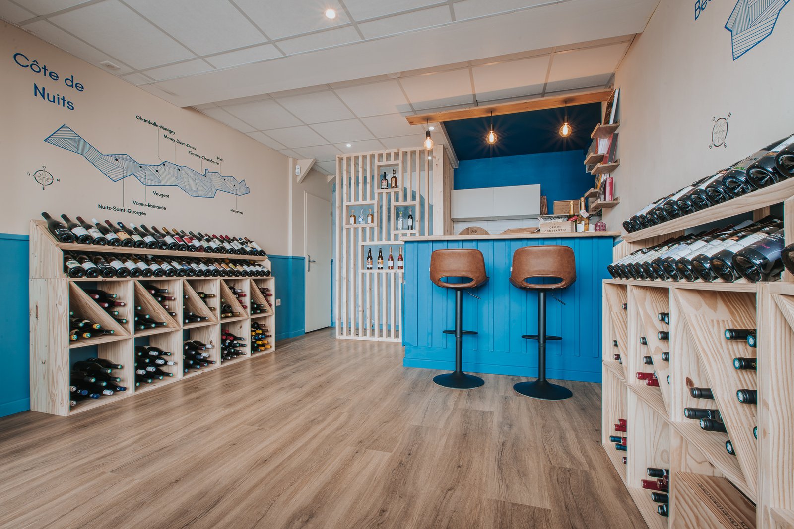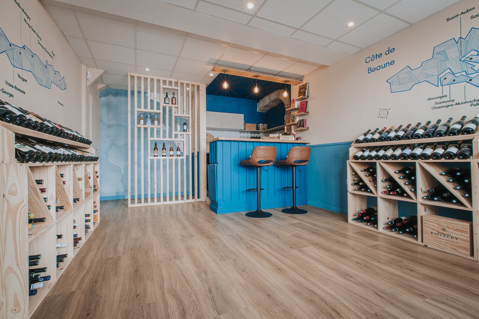 L’enjeu était clair : façonner un espace qui reflète la personnalité du gérant – authentique, passionné, attaché à son territoire – tout en valorisant les bouteilles et domaines représentés.